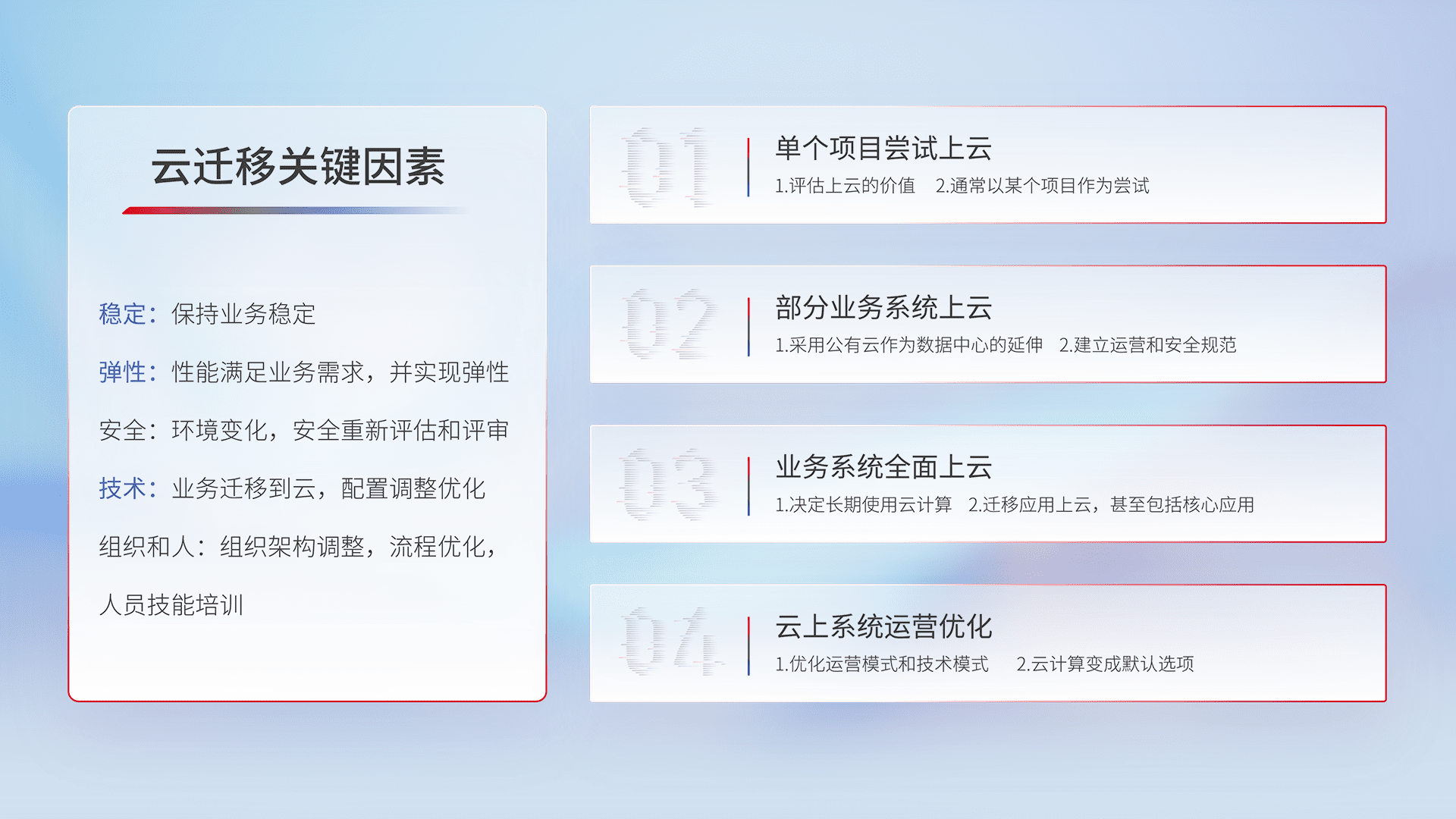 结合实际业务,,,从规划设计、、云平台选型、、、、云原生改造、、、数据迁移、、集成交付,,迁移全过程为客户识别最佳上云路径,,,做好风险识别管理,,,,设计网络架构、、身份权限、、、安全审计合规、、操作审计、、日志审计、、、、监控告警策略、、、多站点容灾设计等,,对云上基础设施进行整体规划,,,提升IT治理水平,,,,以满足弹性、、、、高可用、、高性能的需求。。。