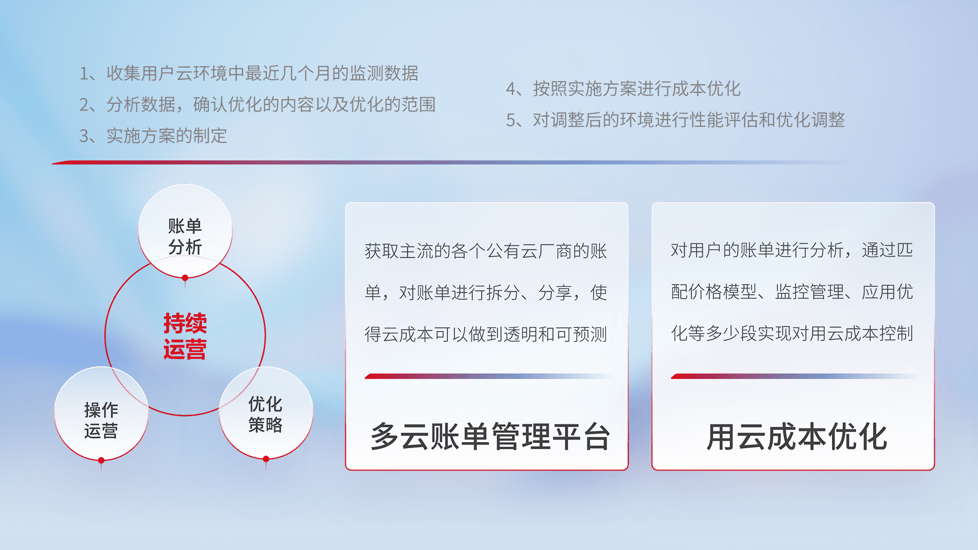 通过多云纳管,,,,以统一的资源数据模型把客户的云资源进行抽象和封装,,,进而实现对多云资源的统一操作,,保障云资源管理的可靠性、、稳定性与可用性。。。。量身定制化运维内容,,配置、、、开发运维、、补丁管理、、备份、、、监控、、、、认证和访问管理、、、、审计和日常巡检等,,,保障在用云过程中的可靠度,,,稳定度以及高可用率。。